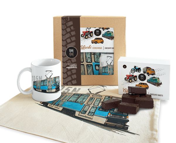 Paczka prezentowa Konstal 105N cukierki czekoladowe 125 gkubek ceramicznytorba bawełniana Paczkę można dodatkowo powiększyć o koszulkę lub bluzę (Kliknij aby zobaczyć wymiary i specyfikacje) Konstal 105NAutorem rysunku jest Mariusz Felek Foltak.