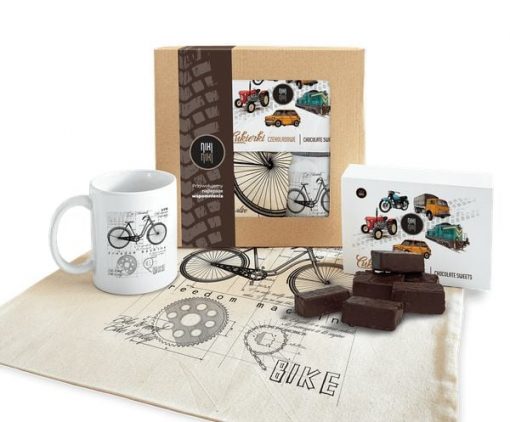 Paczka prezentowa dla fana rowerów Rower cukierki czekoladowe 125 gkubek ceramicznytorba bawełniana Paczkę można dodatkowo powiększyć o koszulkę lub bluzę (Kliknij aby zobaczyć wymiary i specyfikacje)RowerAutorem rysunku jest wrocławski artysta Paweł Grabowski.