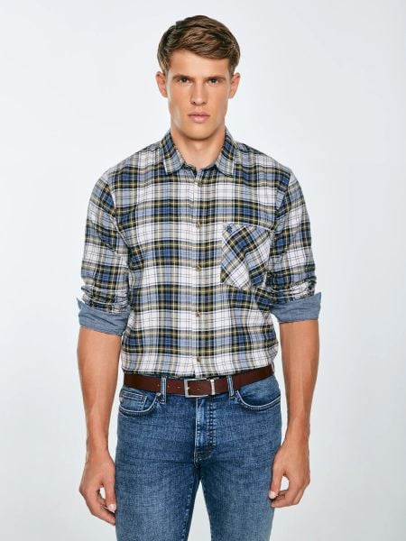 Koszula męska flanelowa w kratę niebiesko-beżowa Koner 401