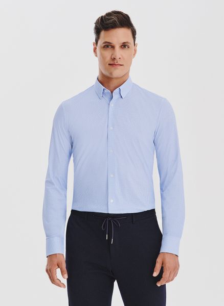 Niebieska koszula w pepitkę – Pako Lorente. Koszula z długim rękawem. Niebieska koszula męska. Skład: 76% poliamid, 24% elastan. Fason: Slim. Traveler.