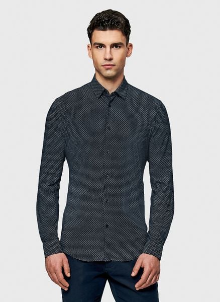 Koszula męska we wzór – Pako Lorente. Czarna koszula we wzór geometryczny z długim rękawem. Wiosenna koszula na guziki. Skład: 77% nylon, 23% elastan. TRAVELER. Fason: Slim.
