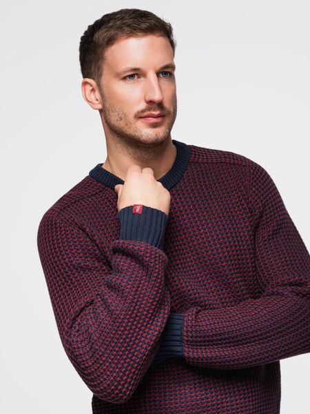 Męski sweter o kontrastowym splocie z okrągłym dekoltem – bordowy V1 – Rozmiar: M