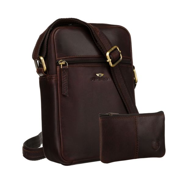 Brązowa listonoszka Peterson z naturalnej skóry, wyposażona w regulowany pasek, liczne kieszenie na suwak i organizer. Elegancka, kompaktowa i praktyczna – idealna na co dzień i do pracy. W zestawie z praktyczną saszetką.